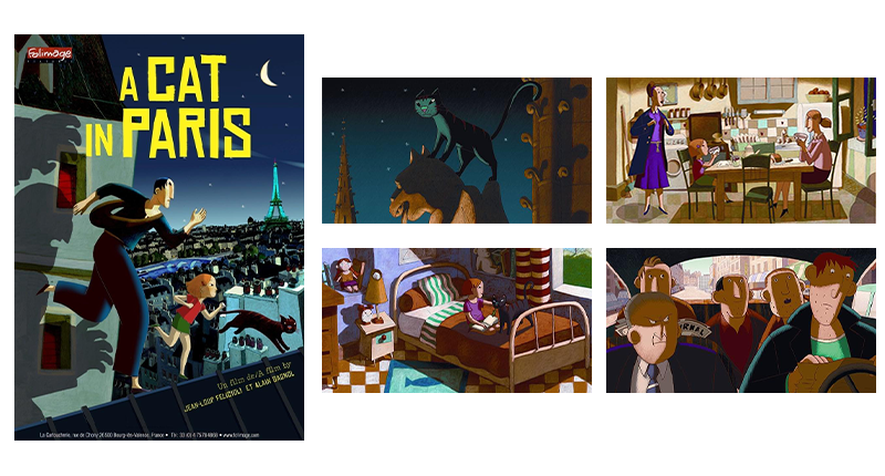 小学校4年生〜6年生のみなさんが見るのは『パリ猫ディノの夜』というフランスのアニメーションです。昼と夜で2つの顔を持つネコのディノと言葉が話せなくなってしまった少女による冒険ミステリー映画です。